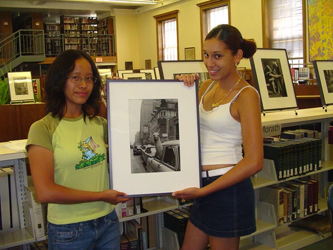 Sarah Sheu and Crytal Morales with Morath's photograph "Encounter at Times Square".